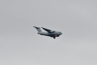 C-2 と思われる機体が南側誘導路を進んできた。R/W09 に着陸したようだが、この位置からは着陸ポイントは見えない。松島基地からの飛来で、ブルーインパルスの支援のためのフライトのようだ。そのまま、明日の航空祭の地上展示機となるのだろう。