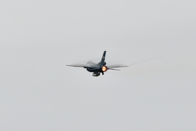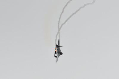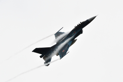 と同じように水平系の機動飛行だ。アフターバーナーを使用したキレのあるフライトだったが、迫力では F-15J には及ばない。F-2A は飛行開発実験団所属の
