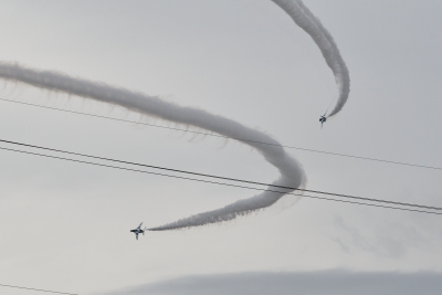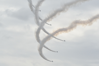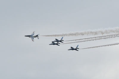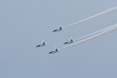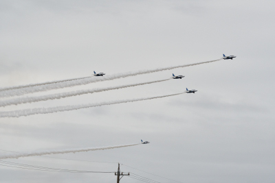 時折雨がぱらついたりしたが、演目はほぼ順調に進められた。1-4番機で行われる「トレイル・トゥ・ダイヤモンドロール」が「ロールバック・トゥ・アローヘッド」に置き換えられた。「ロールバック・トゥ・アローヘッド」を見る機会は少ないが、この演目は会場正面から見てみたい。また、「オポジット・トライアングル」の後に「ピラミッド・ローパス」が行われた。その他、「サクラ」が「スワン・ローパス」に変更となった。