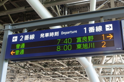旭川市内は青空が広がっているが、結構雲も多く、今日は終日晴れたり曇ったりの予報になっている。通勤通学の時間帯だが土曜日なので、旭川駅構内は閑散としている。根室本線に富良野から乗車するため、富良野線に富良野まで乗車する。 |