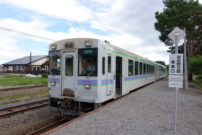 沿線で一番の観光地の美瑛では多くの乗客が降りて、同じくらいの人が乗ってきた。美瑛周辺には観光スポットが点在しているが、距離があるので歩いて見て回るのは難しい。周遊観光バスもあるようだが、列車利用だとレンタサイクル(バイク)やタクシーが必要になると思う。私も何度も美瑛の丘を訪れているが、いずれも自動車で見て回った。 美瑛の次の美馬牛では列車交換のため7分間の停車時間がある。多くの乗客が列車を降りて写真を撮っている。無人の小さな駅だが、驚いたことに8人の下車があり、2人が乗車した。降りた乗客はほとんど観光客のようだ。美馬牛地区にも観光スポットがあるので、そちらに向かうのだろうか。 |