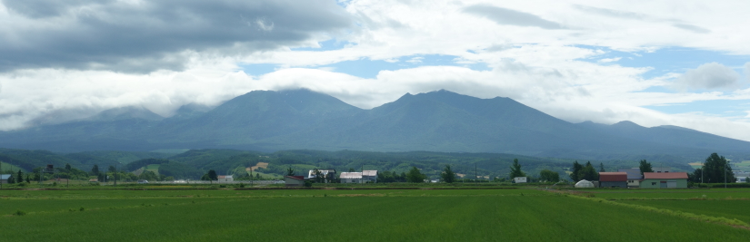 美瑛周辺は素晴らしい風景が広がっているはずだが、線路は防風林に囲まれているので車窓を楽しめる場所は非常に少ない。上富良野町に入ってしばらくたつと、周辺は田園風景に変わり十勝連峰がよく見える。残念ながら雲が多いので、全ての山頂を見ることはできない。 |