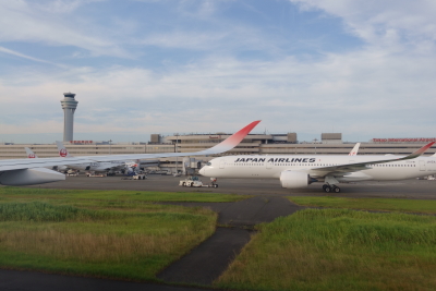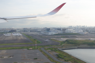 フライトは多少揺れたが順調で、羽田空港では上空で待たされることも無かった。着陸は16Rで、17:39に着陸した。16R着陸なので第1ターミナルへのスポットインも早く、17:43にスポットイン、17:45にドアが開いた。最後尾の座席なので、慌てずに最後の方に飛行機を降りた。 |