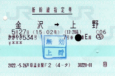 | JR西日本/JR東日本 北陸新幹線「かがやき」534号 9534E 金沢 15:02 → 上野 17:28 | ||||||||||||||