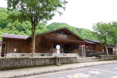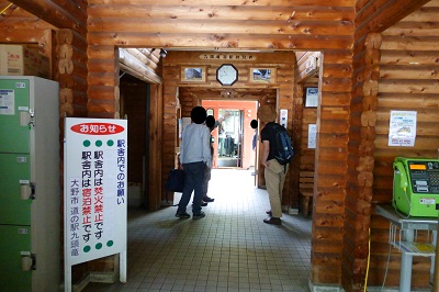 九頭竜湖での折り返し時間は14分しか無いので、急いで列車を降りて駅周辺を見て回る。簡易委託の駅で、券売機はないが窓口でB-POS端末により切符類の購入ができる。入場券を購入したが、結構手間取っていたので、特殊な切符の発券は難しいかもしれない。 駅舎はログハウス風の立派なもので、隣には道の駅九頭竜が並んでいる。道の駅にはファミリーマートが併設されているので、食料などの購入も可能だ。24時間営業ではないので注意が必要だが、越美北線の運行時間には開いている。 |