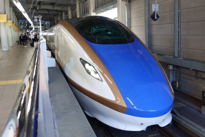 北陸新幹線「かがやき」534号 9834E 金沢発, 上野行き JR東日本E7系新幹線電車 F-5編成(12両/JR東日本/長野新幹線車両センター) 「かがやき534号」はJR東日本所属のE7系で、発車時刻10分前に回送で入線してきた。案の定車内は空いていて、4,5割の座席が埋まった程度だった。途中駅でも数えるくらいの乗車しかなく、空いた車両の中でゆったり過ごすことができた。臨時列車は定期列車に比べると空いている傾向にあるようだ。 |