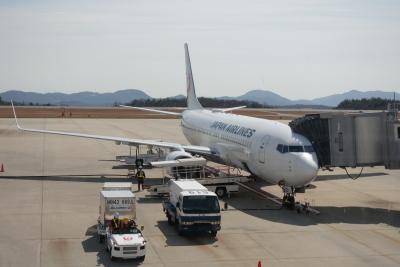 チェックインカウンターで手荷物を預け、時間があるので展望デッキに向かう。搭乗する JAL便は到着済みで、この時間の離着陸の予定は無い。国内線ターミナル前には搭乗予定の JAL B737-800 が駐機しているだけだ。国際線ターミナル前には中国東方航空の上海行きと、香港エクスプレスの香港行きが駐機していた。 |