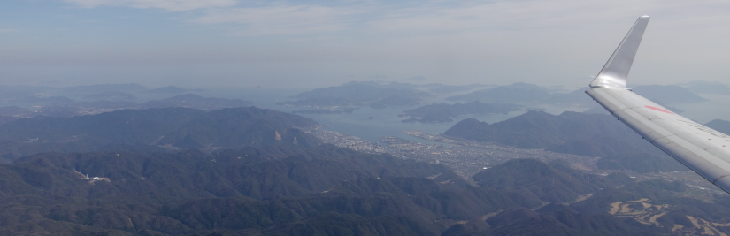 ドアが閉められたのは 14:04 で、機体が動き出したのは 14:07 だった。ほぼ定刻の出発で、離陸は R/W10 からだ。離陸するとすぐに進路を北東に変え、高度を上げていく。右側に座っているので、その時眼下に瀬戸内海を見ることができた。多分、三原方面と思われる。 |