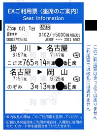 掛川で東海道新幹線に乗り換える。今回は EXダイナミックパックで個別にモバイルSuicaを登録したので、そのまま乗り換え改札を利用できるはずだ。しかし、初めての利用で不安だったので、一度改札を出て、新幹線改札から入場した。もちろん無事に改札を通過でき、自動改札から「EXご利用票」が出てきた。昔の人間なので、紙のきっぷがないと落ち着かない。 |