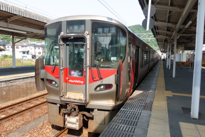 山陽本線 普通 329M 糸崎発、南岩国行き JR西日本227系電車0番台 S-10(2両)+S-16編成(2両)(下関総合車両所広島支所) 車両は 227系四両編成で、既に入線していた。417M からの乗り換えが多く、半分くらいの座席が埋まった。 |
