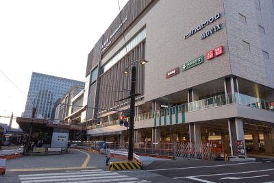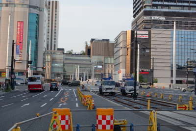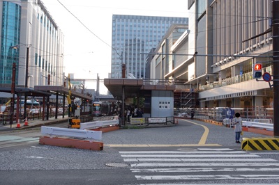 岡山電気軌道/東山本線 岡山駅前発、東山行き 岡山電気軌道岡軌7100型電車 / 7102 乗り場が駅前広場に面している大きな道路の先にあるので、地下道を通るかぐるっと遠回りをして横断歩道を利用しなければならないので不便だ。しかし、駅前広場は現在整備中で、2026年度末には駅前広場に路面電車が乗り入れることになっている。 |