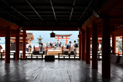 厳島神社へは混雑する表参道商店街を避けて海沿いの道を歩いたが、厳島神社の拝観券を交換する「TOTO宮島 おもてなしトイレ」に向かう道を通り過ぎてしまった。結局、混雑している表参道商店街を戻ることになった。「宮島・瀬戸内tabiwaぐるりんパス」には厳島神社と宝物館の拝観料が含まれているが、指定場所でデジタルチケットを提示して拝観券と交換しなければならない。 今回の厳島神社訪問の目的は、海に浮かぶ大鳥居と社殿を見ることだ。前回(2008年5月)訪れたときは大潮で、地面(海底)が丸見えで趣がなかった。しかも、大鳥居の周辺は潮干狩りの人であふれていた。今回は満潮では無さそうだが、海に浮かぶ厳島神社を見ることができたので、目的は達成された。前回訪れたときはゴールデンウィークで大混雑だったが、今回は平日なのにその時に負けないくらい混雑している。インバウンドの影響で外国人観光客が非常に多い。また、現在は東回廊構造補強工事中で、工事部分には白いシートが掛けられていて興ざめだった。 |