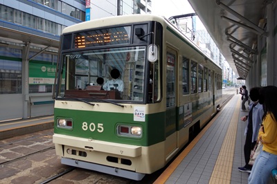 広島電鉄/1号線 広島駅発、広島港行き 広島電鉄800形電車 / 805号車 広島港行きの路面電車は、日中、1時間に5本運行されている。乗車したのは単車の 800形で、車内は混んでいたが座ることが出来た。800形は 1983~1997年にかけて製造されたが、近年連接車を積極的に導入しているので、単車体のボギー車の最後の形式となっている。 |