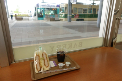 終点の広島港(宇品)停留所は、広島港宇品旅客ターミナルに接している。2面3線の大きな停留所で、頭端式のABCの3つのホームがある。1号線、2号線、5号線が乗り入れていて、広島駅や中心市街地、西広島駅と直接結ばれている。ホームはいずれも連接車2本が停車できる長さで、全体に屋根が架けられている。 広島港宇品旅客ターミナルビルは3階建ての大規模なもので、食堂、喫茶、土産店等がある。時期、時間帯によっては多くの乗客で賑わうのだろうが、今の時間は閑散としている。食堂の多くはまだ空いていなかったので、パン屋でサンドウィッチと飲み物を購入して、イートインスペースで食事をとる。 |