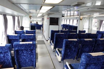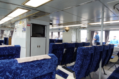 宮島口発の便については、9時台から 16時台前半の便で厳島神社大鳥居沖経由のサービスを行っているが、宮島発の便は宮島口にまっすぐ向かう。結構多くの乗客が乗船したと思ったが、座席には空席が多い。最大定員は 800名(車両無しの場合)なっているが、どのくらいの乗客が乗船したかはわからない。3階の展望デッキに向かった乗客が多いようだ。 |