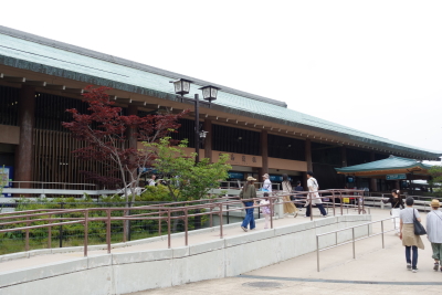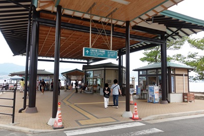 何処も観光客だらけなので、厳島神社と宝物館を一通り見て、宮島桟橋に戻る。「宮島・瀬戸内tabiwaぐるりんパス」で宮島口に向かうには、JR西日本宮島フェリーを利用する。宮島松大汽船には乗船できない。 宮島桟橋旅客ターミナルは、1976年2月1日に完成した鉄筋3階建ての立派な建物だ。駅舎(建物)は神社の本殿を、桟橋は神社の回廊をそれぞれイメージして作られている。建物そのものは廿日市市が管理していて、一つの駅舎の中にJR西日本宮島フェリー(1号桟橋)と宮島松大汽船(2号桟橋)の乗場が同居している。桟橋は3本設置されていて、改札及び桟橋は独立しているが、待合所やトイレなどは独立していない。 |