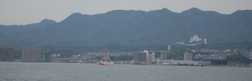 この航路は、プリンスホテル港に立ち寄る。広島港のすぐ隣にある宇品島にグランドプリンスホテル広島があり、ホテルの利用者を対象にした寄港のようだ。ここでは 10数人の乗船があった。この船の椅子席定員は 88人となっているので、船室内はがらがらだ。 プリンスホテル港を出航したら、一路宮島へ向かう。安芸小富士と呼ばれる山のある似島を左手に見て広島湾を進む。似島は行政区分としては広島市南区似島町に属し、市域の最南端に位置する。広島市内の島としては最も大きく、人口約 700人の小さな島。瀬戸内は多くの島があり、似島の奥の方にも島の姿が見える。 |