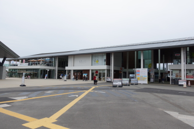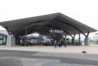 広島電鉄の広電宮島口駅は、宮島口フェリー乗り場の目の前にある。現在の駅は、2022年7月2日に現在地に移設開業した。頭端式ホーム4面4線の地上駅で、ホームの上屋は巨大な屋根で全ホームを覆う形が採られている。駅の移設に際して、旧駅時代にあった改札口と自動券売機は廃止され、駅で行ってきた集札業務も共に廃止された。 |