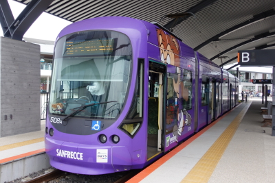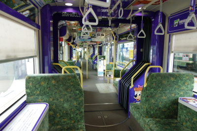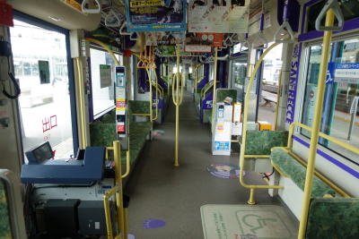 広島電鉄/2号線 広電宮島口発、広島駅行き 広島電鉄5100形電車「Green mover max」 5108編成「サンフレッチェ電車」 乗車したのは 2004年に登場した 5100形電車だ。国産初の100%フルフラット超低床電車で、5連接車(5車体3台車)の構造だ。後部車両に車掌が乗務している。5車体3台車の構造のため、座席配置が特殊で、いろいろ工夫して配置していると思われる。 |