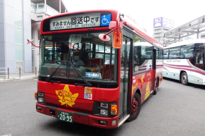 平和公園前バス停から「めいぷるーぷ」(観光周遊バス)で、広島駅に戻る。専用のラッピングを施した車両が使用されている。広島地域の路線バスと異なり、前乗り定額(200円)先払い、中降りとなっている(「宮島・瀬戸内tabiwaぐるりんパス」で乗車)。 |