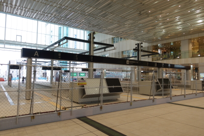 ホテル方面に向かうため、広島駅を新幹線口から南口へ南北自由通路を歩いた。自由通路の突き当たりに、8月使用開始予定の新しい広島電鉄・広島駅停留場がある。まだ工事中だが完成間近だ。南口駅ビル「minamoa」の二階にあり、JR改札と同一面で4面4線の頭端式ホームを有している。駅ビルの中に高架で路面電車が直通するのは珍しいことで、東急玉川線渋谷駅(1969年廃止)以来、56年ぶり・2例目となるそうだ。 |