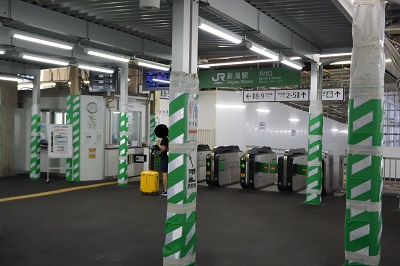 新潟駅は駅周辺整備事業・連続立体交差化の真っ最中だ。現在は在来線の高架化と、万代口の整備が進められている。2年前に訪れた時には万代口駅舎は使われていたが、現在駅舎は解体中で、不便なところに臨時改札口が設けられている。 |