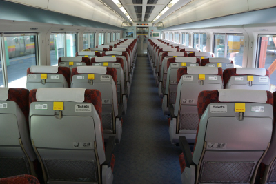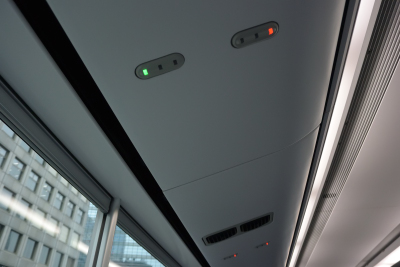 特急 「かいじ」35号 東京発、甲府行き JR東日本E353系電車 S-102編成 (9両/松本車両センター) E353系の内装は寒色系のデザインだが、暗い感じはしないで落ち着いている。シートは可動式枕付きで、最新型の特急にふさわしいサービスだ。この車両の一番の特徴は、座席上の荷物棚に赤・黄・緑の3色のLEDランプで指定席の発売状況が確認できる座席上方ランプが設置されたことだ。 |