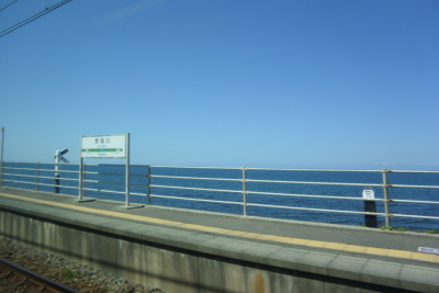 青海川駅は「日本一海に近いところにある駅」で有名で、ほんとうに日本海に臨むように造られている。小さな無人駅だが、臨時快速「越乃Shu*Kura」が記念撮影等のために停車する。 |
