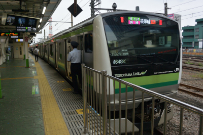 横浜線 快速 4648K 八王子発、桜木町行き JR東日本E233系電車6000番台 H-025編成 (8両/鎌倉車両センター) 混雑することの多い快速だが、横浜寄りの車内には空席が十分ある。 |