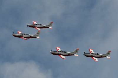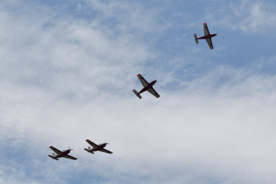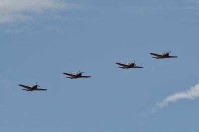 航空祭のフライトプログラムは、一時間遅れで T-7 四機によるオープニングフライトから始まった。9時と 9時45分頃と二機ずつ別々に離陸した機体が、空中集合して基地上空に戻ってきた。オープニングフライトなので航過は一回だけで、再びエシュロン隊形で上空に戻ってきて、上空でブレイク後順番に着陸していった。使用ランウェイは R/W27 だ。
