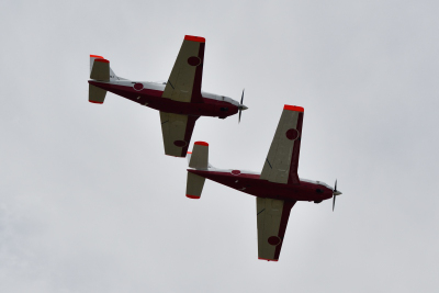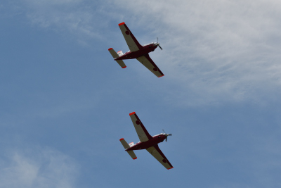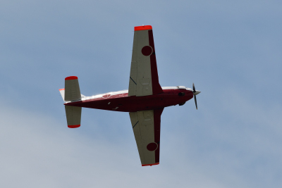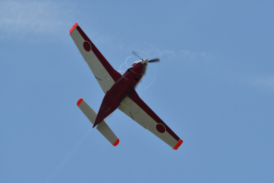 四機が着陸したが、#941 と #911 の二機は再び R/W27 より離陸した。プログラム上は T-7 オープニングフライトとなっているが、その後半は二機による機動飛行だ。二機による編隊飛行が中心だが、ブレイク後は各機自由に上空を飛び回った。これまでとは少し見せ方が違うフライトだ。基地上空には青空が広がってきて、まずまずの航空祭日和となってきた。