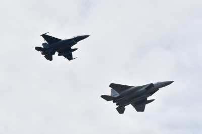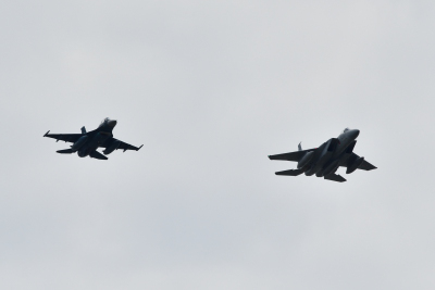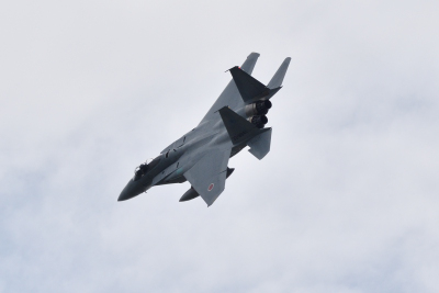 定刻に、F-15J と F-2B の二機が並んで上空にやって来た。飛行開発実験団の F-15 と F-2 は静浜の常連だが、こうした並んでのフライトは初めてだ。このワンパスで終わりかと不安になったが、そのまま F-15J の機動飛行が始まった。機動飛行といってもいつものようなものでは無く、水平系のフライトを軽く披露しただけだった。どうやら、アフターバーナーは使用していないようだ。