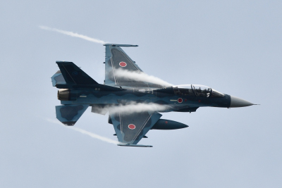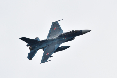 F-15J が帰投すると、少し間を置いて F-2B の機動飛行が始まった。こちらも F-15J と同じような緩ーい機動飛行だ。こちらもアフターバーナーは使用していないようなので迫力は今ひとつだったが、この天候の中でフライトを披露してくれたのはありがたい。