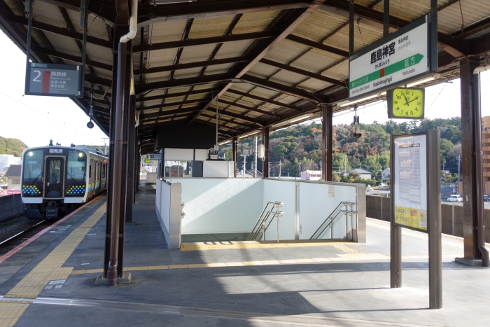 18きっぷを使って、未乗車区間が多く残っていた千葉県の JR線の乗車に出かけた時、荒野台から鹿島臨海鉄道(鹿島線)直通の列車に乗車して到着した。鹿島神宮を見学の後、鹿島線の普通電車に乗車して香取へ向かった。鹿島神宮はその前、荒野台へ向かうときに乗り換えに利用した。 島式ホーム1面2線を有する高架駅で、成田統括センターの直営駅。自動券売機・指定席券売機、簡易Suica改札機が設置されているが、磁気用の自動改札機はない。鹿島線はSuicaエリアであるが大洗鹿島線はエリア外であるため、鹿島サッカースタジアム駅より先(荒野台・水戸方面)への乗車に交通系ICカードは利用できない。 2023.12.14 |