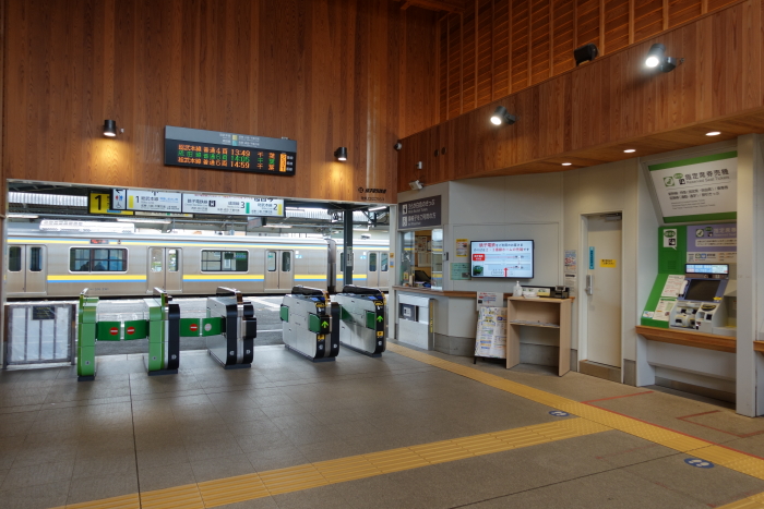 「青春18きっぷ」を使った乗りつぶしの旅で、宇キ宮から日光線に乗車して、近くの撮影場所で 205系などを撮影した。撮影後当駅に戻り、日光線に乗車して日光に向かった。 島式ホーム1面2線の地上駅。駅舎は2014年に建て替えられた。日光駅管理、JR東日本ステーションサービス受託の業務委託駅で、簡易Suica改札機設置駅。指定席券売機が設置されている。 2022.01.05 |
