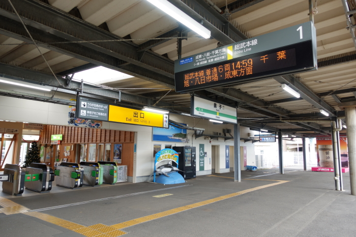 18きっぷを使って、未乗車区間が多く残っていた千葉県の JR線の乗車に出かけた時、香取から成田線の普通電車に乗車して到着した。そして、総武本線の普通電車に乗り換えて千葉へ向かった。 JR東日本と銚子電気鉄道の共同使用駅で、JR東日本が駅を管轄している。単式ホーム1面1線と島式ホーム1面2線および島式ホームの一方を切り取った切欠きホーム1線、計2面4線のホームを持つ地上駅。2・3番線ホームの一番奥に銚子電鉄用の切欠きホーム(1面1線)がある。 JR線と銚子電鉄線とは、駅構内配線の関係及び銚子電鉄の購入した車両搬入のためレールの接続はなされているが、両鉄道の架線電圧が違うので、架線の接続はなされていない。 2023.12.14 |