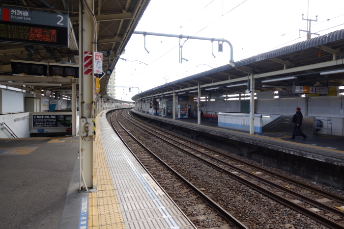 18きっぷを使って、妻と成田山新勝寺に初詣に出かけた時に利用した。成田山まで出かけるので、千葉県内のJR線未乗車区間として残っている、東金線、成田線空港支線、我孫子支線に乗車した。東京から京葉線の外房線直通快速に乗車して大網で下車、東金線に乗り換えて成東に向かった。 外房線の相対式ホーム2面2線と、東金線の島式ホーム1面2線の計3面4線を有する高架駅。両線のホームは昇降部で20mほど離れている。東金線は当駅が起点。指定席券売機・コインロッカーが設置されている。茂原統括センターの直営駅。 2024.01.07 |