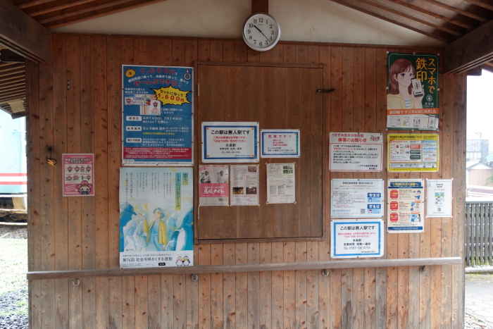 JR日光線を走る205系電車を撮影に訪れたとき利用した。上今市から乗車して、当駅で下車して撮影場所に歩いて向かった。撮影後はJR今市駅まで歩いてJR日光線を利用した。この駅を利用するのは二度目で、2013年3月に日光線を走る107系電車を撮影した時、撮影の帰りに利用した。 相対式ホーム2面2線を有する地上駅。駅員無配置駅。日光市杉並木公園ギャラリーが併設されている駅舎は東武日光方面ホーム側にあり、浅草方面ホームとは跨線橋により連絡している。浅草方面ホームには北口があるが、駅舎は設置されていない。 2022.03.09 |