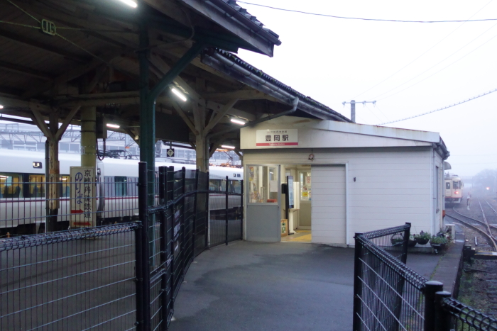 「青春18きっぷ」(3日間用)を使って、二泊三日の天橋立と彦根城を見学する旅に出かけたとき、和田山から山陰本線の普通電車に乗車して到着、豊岡市内に宿泊した翌日、京都丹後鉄道宮津線の普通列車に乗車して天橋立に向かった。 兵庫県北部の中心都市・豊岡市の中心駅。JR西日本の山陰本線と、京都丹後鉄道の宮津線が乗り入れ、接続駅となっている。両社は独立した駅舎を持っている。 頭端式ホーム1面1線を有し、JR線の1番のりばの線路反対側を切り欠いたホームとなっている。JRとは独立した駅舎を持っていて、JR側からも中間改札と柵で仕切られている。直営駅で、15駅の有人駅の一つ。宮津線は当駅が終点で、「宮豊線」の愛称区間に含まれる。 2024.12.30 |