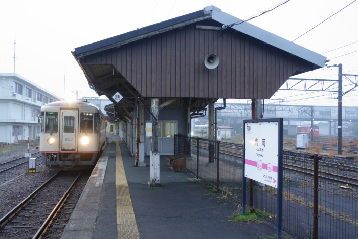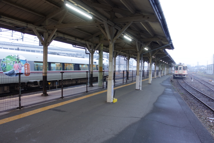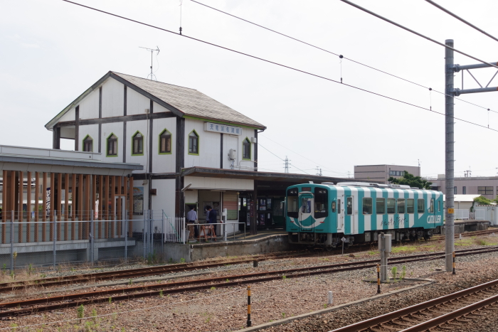 「大人の休日倶楽部パス」を使った青森、新潟への旅行で、五能線乗車時JR五所川原駅に途中下車した際覗いてみた。津軽鉄道ホームへは別途入場券必要とのことだったので、そこまで行くことができなかった。 単式ホーム1面1線を有する地上駅。通路および跨線橋はJRと共用しているが、駅舎や改札口は異なる。駅舎に出札窓口を設ける。夜間・早朝時間帯(19:05− 翌朝6:55)は窓口が休止となるが、運転扱いのため、ホームにある運転室には終日駅員が配置されている。駅前には雰囲気満点の津軽鉄道本社と弘南バス五所川原駅前案内所がある。 2018.06.25 |
