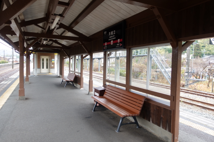 「青春18きっぷ」(3日間用)を使って、二泊三日の天橋立と彦根城を見学する旅に出かけたとき、豊岡から京都丹後鉄道宮津線の普通列車に乗車して到着、天橋立を見学後、京都丹後鉄道宮津線の普通列車に乗車して宮津に向かった。 日本三景の一つに数えられ、全国的に有名な観光地、天橋立への鉄道での玄関口で、丹後観光の拠点ともなる駅。2015年(平成27年)5月に駅舎及び駅周辺が改装された。電化路線の宮福線の宮津駅から延長する形で宮豊線の当駅までの区間も電化されていて、JR線からの電車特急が当駅まで乗り入れてくる。 単式・島式の複合型2面3線のホームを持ち、列車交換や待避が可能な地上駅。単式の3番のりば側に駅舎があり、島式の1・2番のりばへは階段の跨線橋か、エレベーターの跨線橋で連絡している。有人駅で、丹鉄の直営駅。 2024.12.30 |