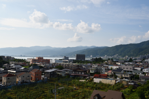 日曜日の夕方だが、公園内に人の姿は少ない。地元の人が散歩している程度だ。また、資料館になっている天守に入場しているのは、他に一組だけだった。三階の展望台から諏訪湖を眺めることが出来るが、湖までだいぶ距離がある。かつては諏訪湖に突き出した水城だったが、江戸時代初めに諏訪湖の干拓が行われ、水城の面影は失われてしまった。
