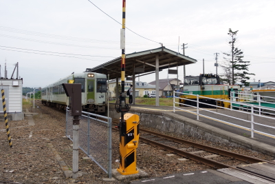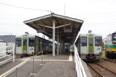 旅行二日目は、大館から盛岡まで花輪線に乗車後、仙台まで東北新幹線で移動する。東北本線下りに乗り換えて岩切で下車、東北本線利府支線に乗車して利府まで往復する。仙台に戻り、再び東北新幹線に乗車して大宮まで移動、上越新幹線に乗り換えて浦佐で下車する。浦佐では上越線に乗り換えて、今日宿泊する小出に向かう。 いつものようにホテルは早いチェックアウトで、6:21発の列車に合わせて6時前には出発する。外は曇り空だが、大清水トンネルを抜けるまでは雨には遭わない予報だ。大館駅まで12分で到着、ホテルの案内通りの時間だ。まだ早い時間のせいか、駅には人の姿がほとんど無い。とりあえず自動改札を通り花輪線にホームに向かう。 |