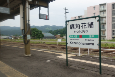 周辺が賑やかになってくると、鹿角花輪に到着する。鹿角市の代表駅で、花輪線の線名の由来となった駅だ(旧駅名・陸中花輪)。鹿角花輪で高校生は全て下車した。一般の乗客のほとんども下車して数人が乗車しただけなので、車内は再び静かになった。 乗車してきた大館から鹿角花輪までが、昨年の災害で不通になっていた区間だ。不通区間には代行バスが運行されていたが、運行されていたのは朝と夕方・夜だけだった。それ以外の時間帯は、秋北バスが運行する路線バス「大館花輪線」に乗車することが出来て、さらに鹿角花輪-大館間の利用に限り高速バス「みちのく号」まで利用できた。ただし、「大館花輪線」と「みちのく号」を利用するのには、事前に鹿角花輪駅もしくは大館駅の窓口で「振替輸送依頼書」を発行してもらう必要があった。 |