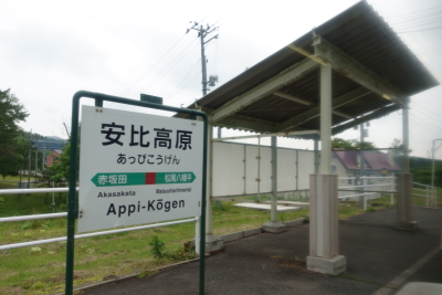 安比高原では7、8人が乗車して出発した。龍ケ森越えの下り勾配区間で、右に左にカーブしながらどんどん標高を下げていく。こちら側も 33.3‰ の急勾配だが、下りなので快調だ。間もなく、松尾八幡平に到着した。かつては古い木造駅舎があったが、今は簡素な待合室だけだ。 |