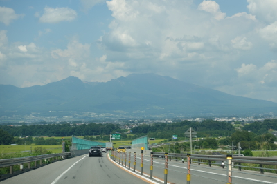 佐久臼田インターまで戻り、中部横断道を北上する。次の目的地は小諸の懐古園だ。中部横断道をしばらく走ると佐久平(佐久盆地)へ下っていき、正面に大きな浅間山の姿が目に飛び込んでくる。ここまで雲が多かったので南アルプスも八ヶ岳も見ることができなかったので、この絶景に感激した。